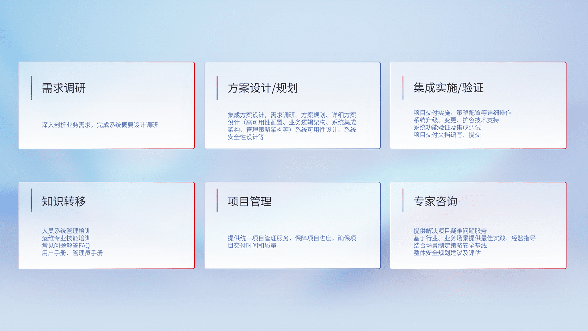 针对客户行业特性,,将宏观的安全战略和需求,,,,通过专业的交付服务,,,,实现项目落地,,,为客户提供标准规范的集成交付服务。。。。